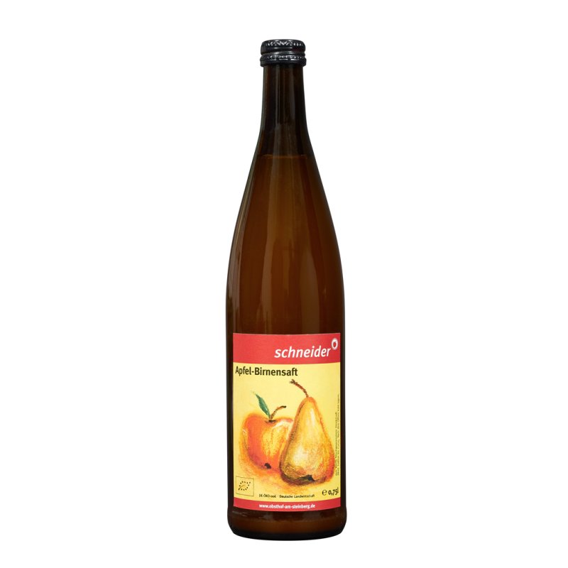 Schneiders Apfel-Birnensaft keltern wir aus unseren hofeigenen Bio-Früchten. Die Zusammensetzung schwankt jährlich – je nach Behang der Bäume und der Sorten. Wir achten auf eine ausgewogene Balance aus Süße, Säure und Aroma. Da wir die Früchte für unsere Säfte möglichst spät und von Hand sammeln, sind sie vollmundig und harmonisch.